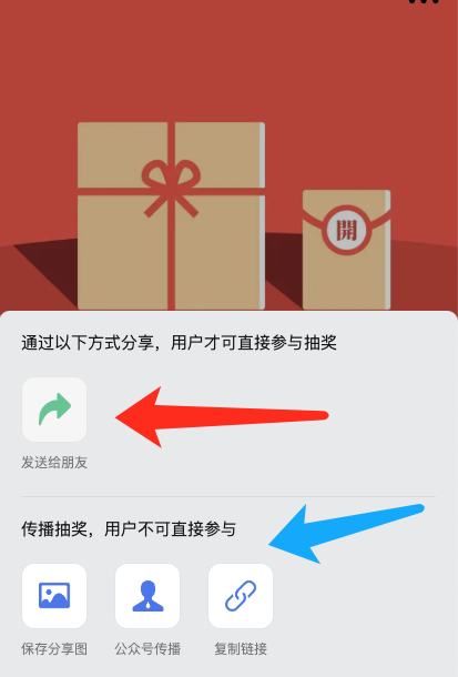 蓝色箭头对应的三种分享方式,只用于抽奖传播,而无法参与