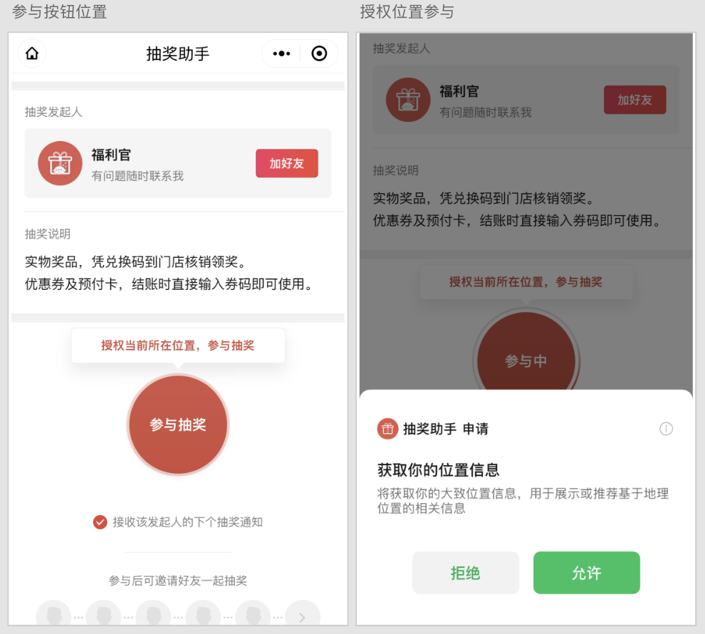 用户点击参与按钮 - 提示授权位置 - 符合即可参与成功。
