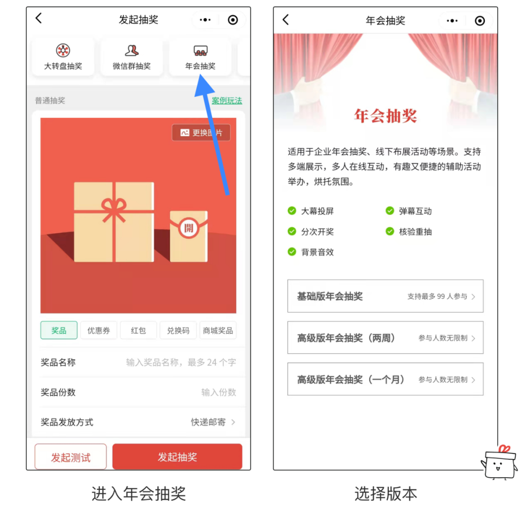 在「企业微信」上,进入年会抽奖发起页,选择对应模式。