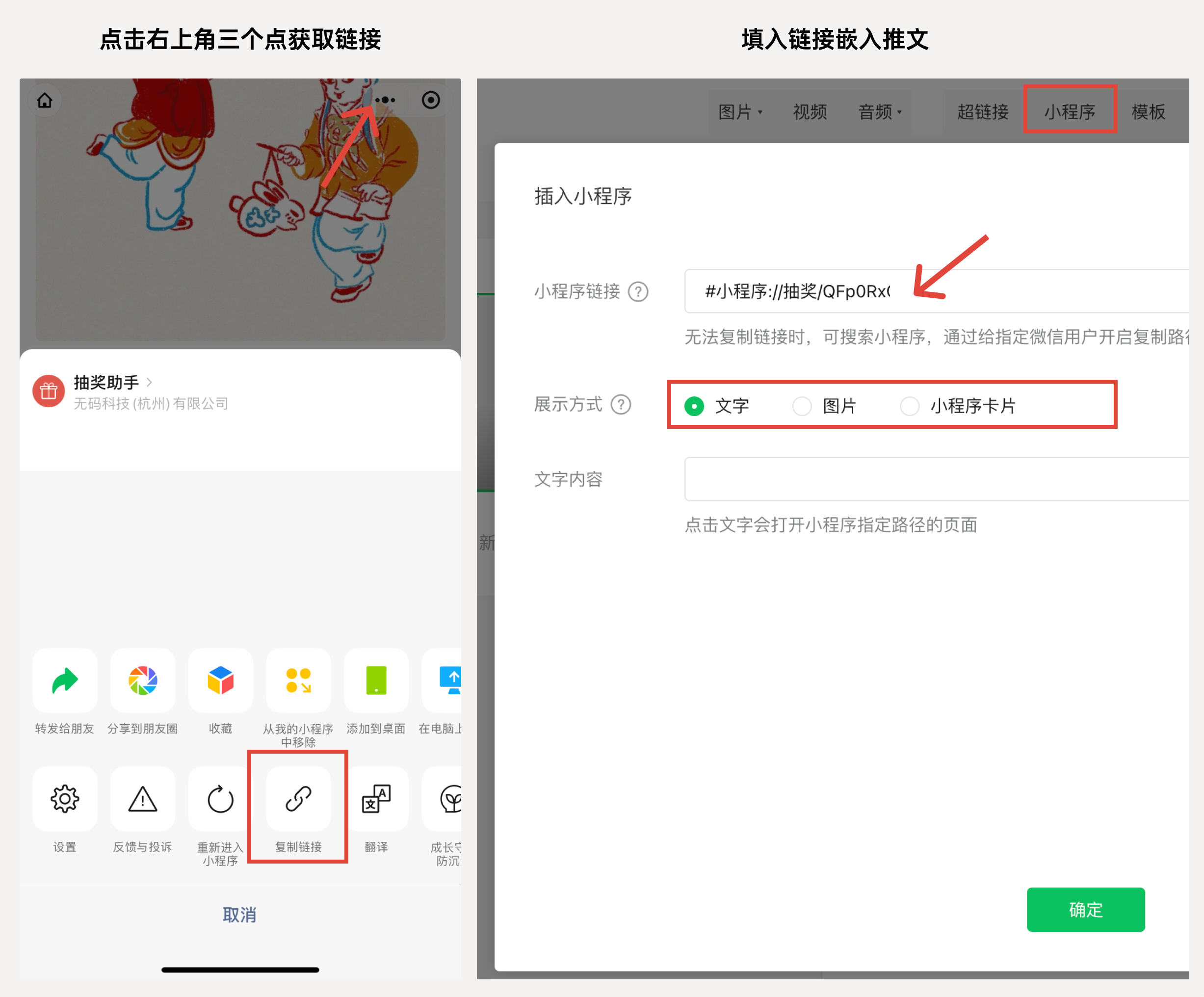 在抽奖活动页面,点击右上角三个点获取抽奖链接,一键插入公众号推文,高效引流。