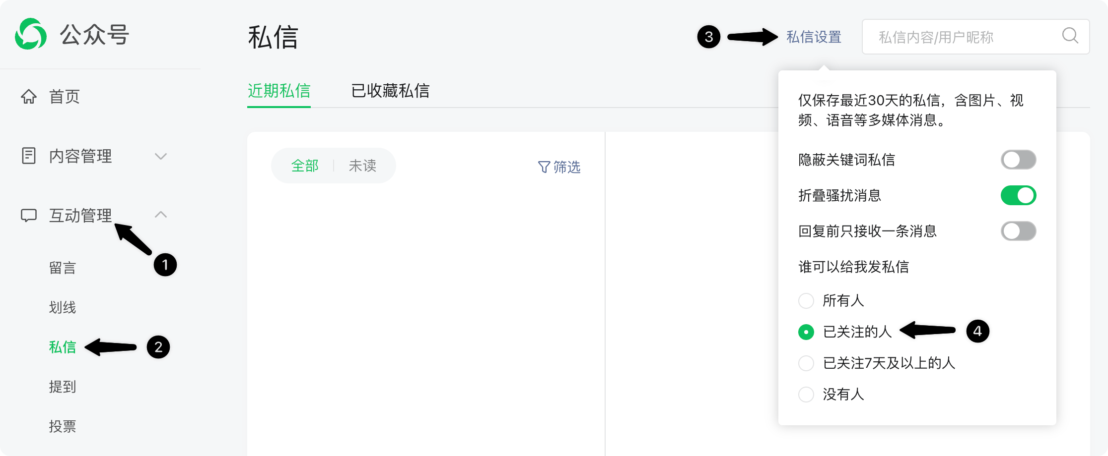 在左侧菜单选择「互动管理」下的「私信」