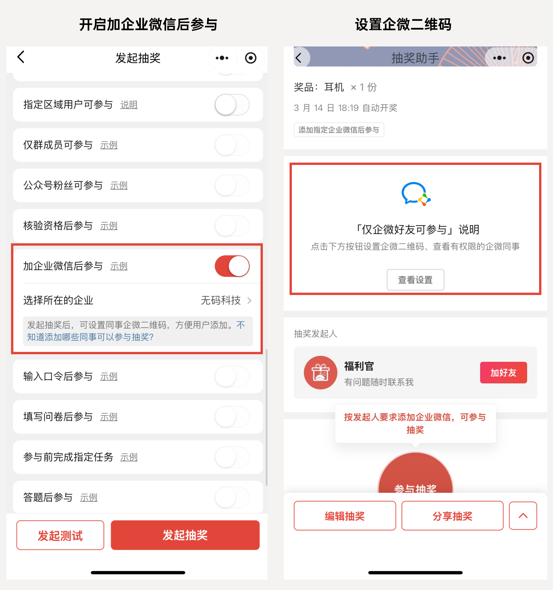 第一步:开启「加企业微信后参与」功能,并保存抽奖。