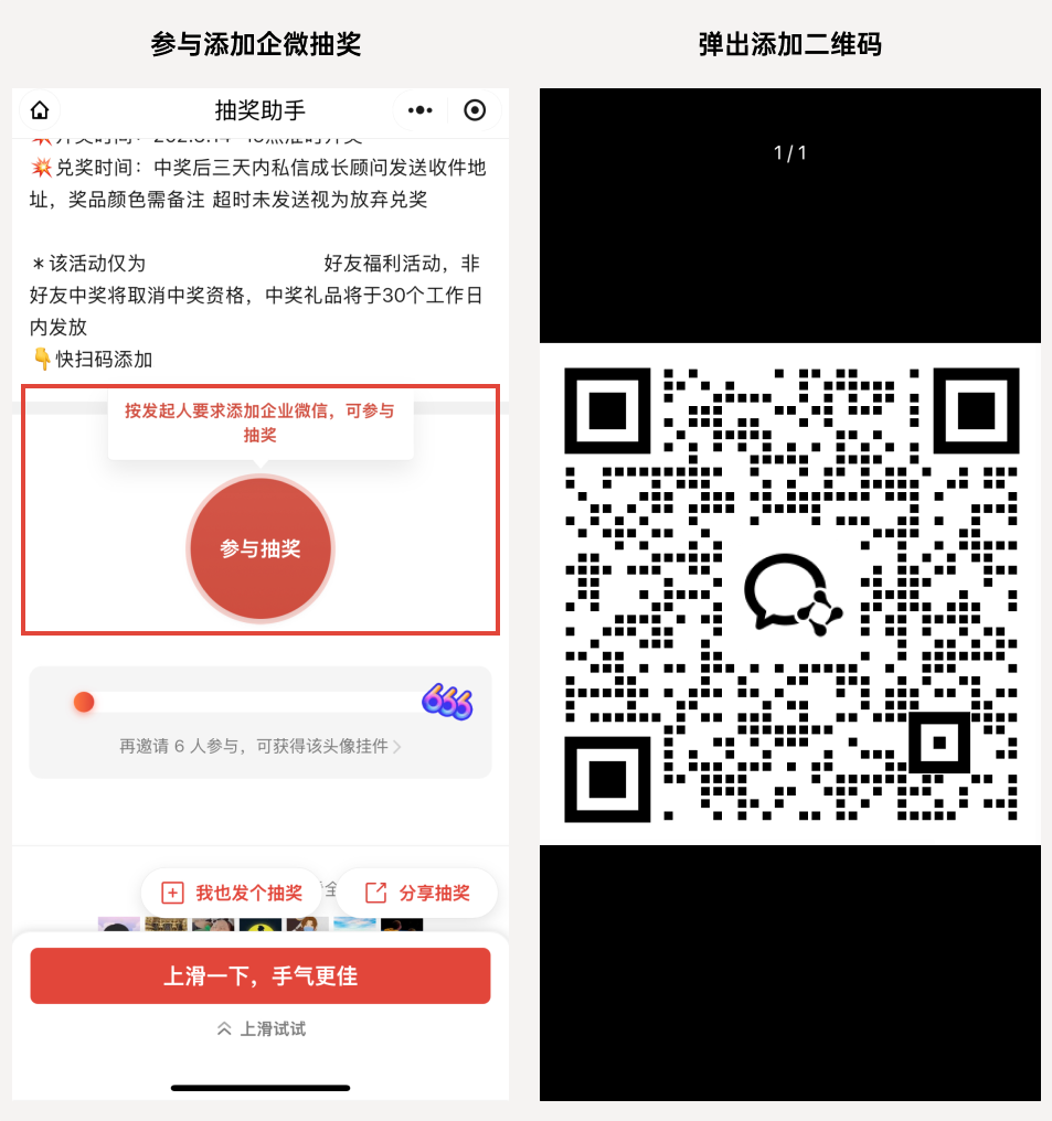 非企微好友,弹出二维码后参与抽奖。已经是企微好友的用户,直接参与成功。