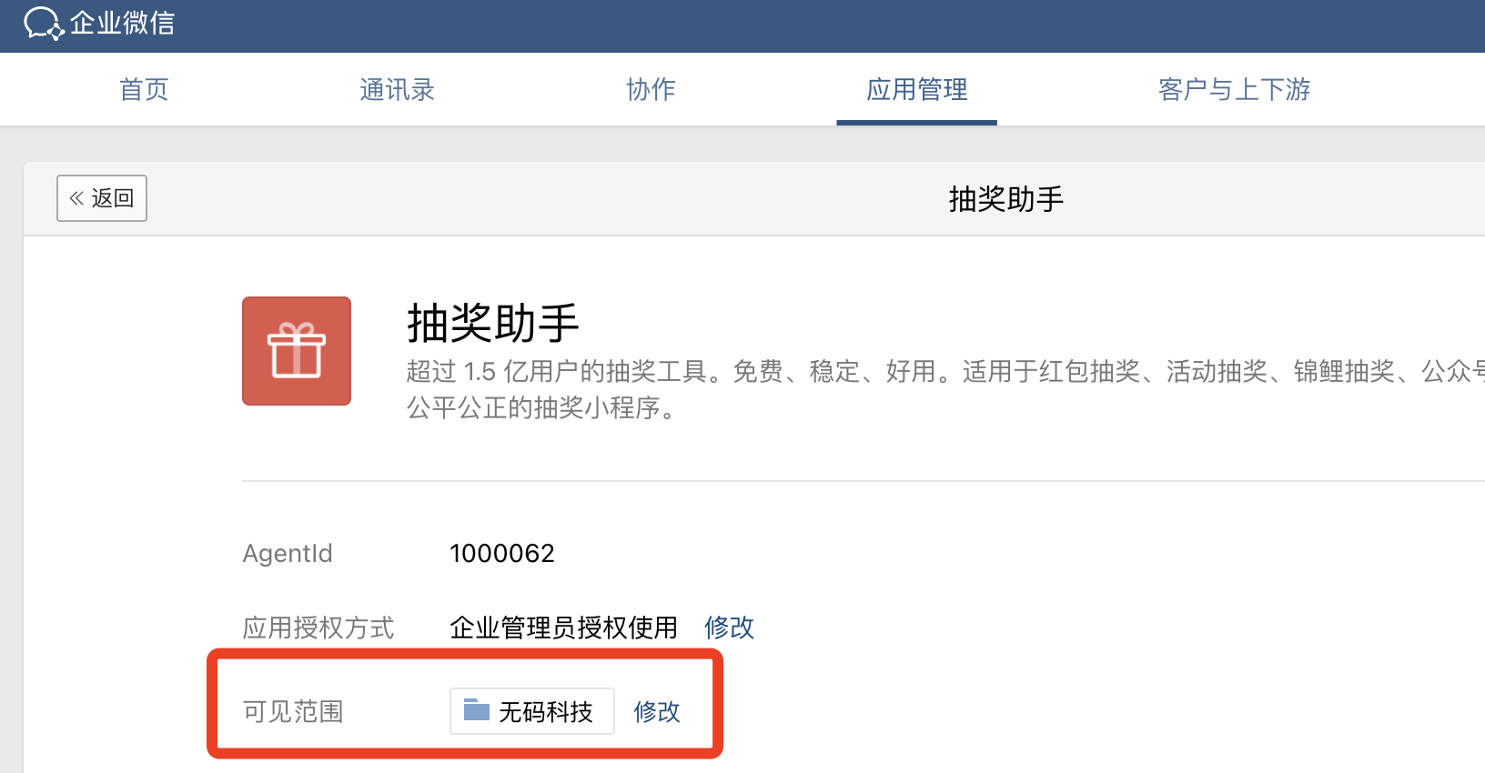 登录企业微信后台,检查被添加的企业微信是否在「可见范围」内,在范围内才能添加参与成功。