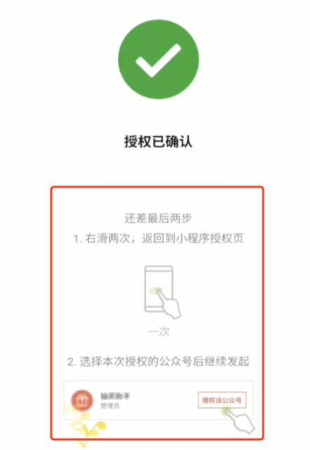 请注意,管理员常常在这一步后,停止操作,以为完成了授权。实际此刻完成的是「公众号授权给抽奖助手」,但还需要返回一下,将此权限授权给你(发起人)。