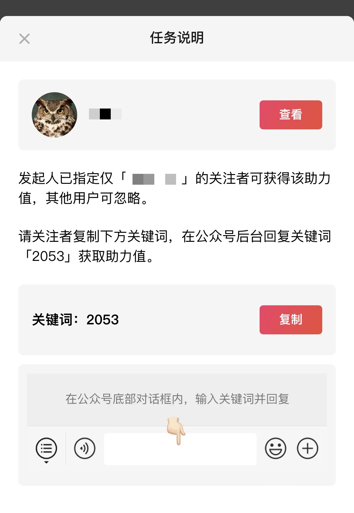 用户在参与抽奖后,如果想要去公众号回复关键词助力,会显示下方弹窗: