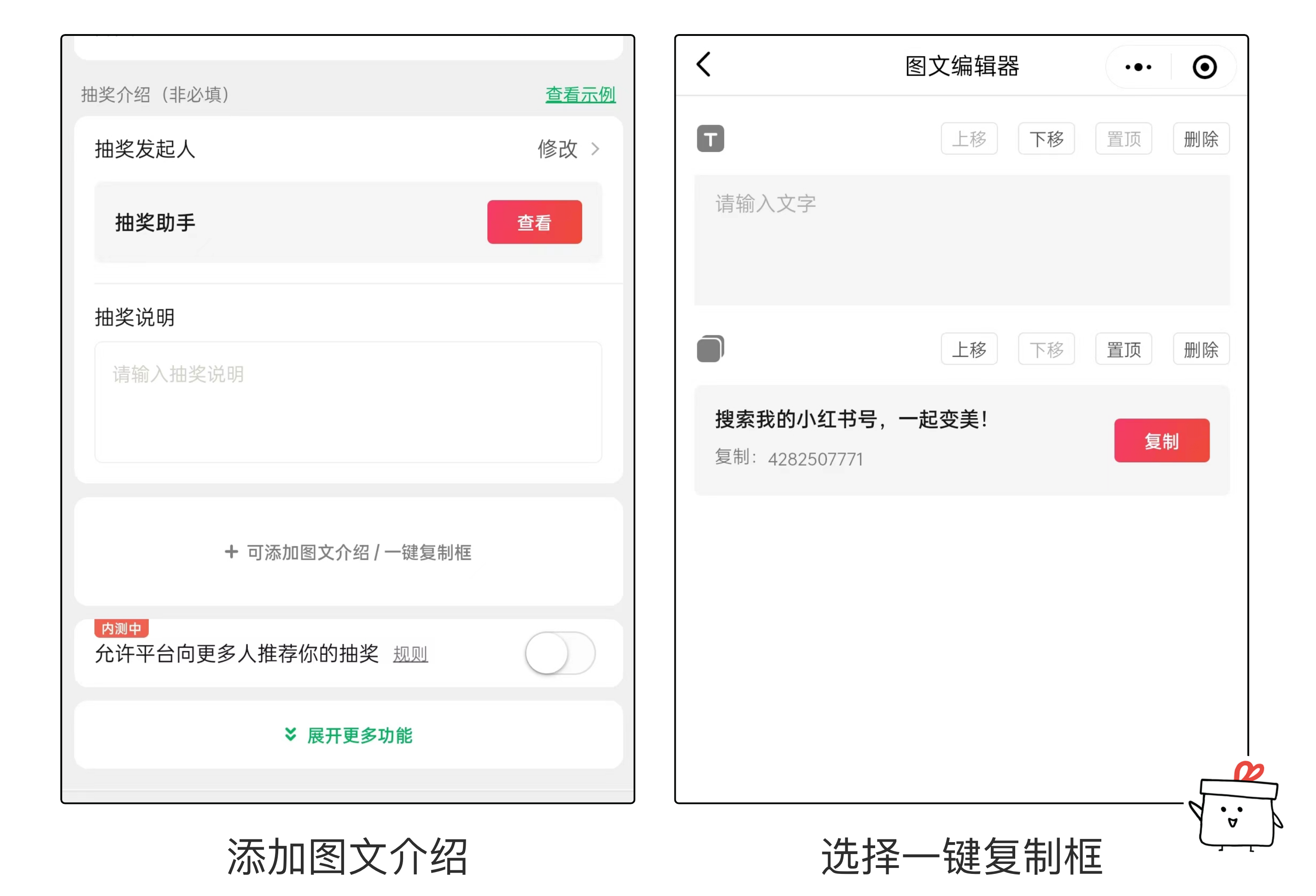 发起抽奖时,点击图文详情,选择一键复制框。
