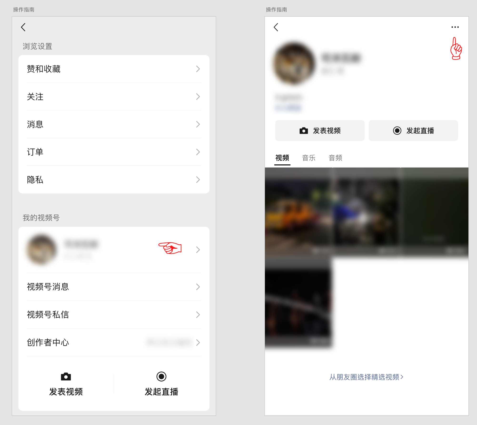- 点击下方视频号的名称,进入视频号的个人主页,再点击右上角三个点。