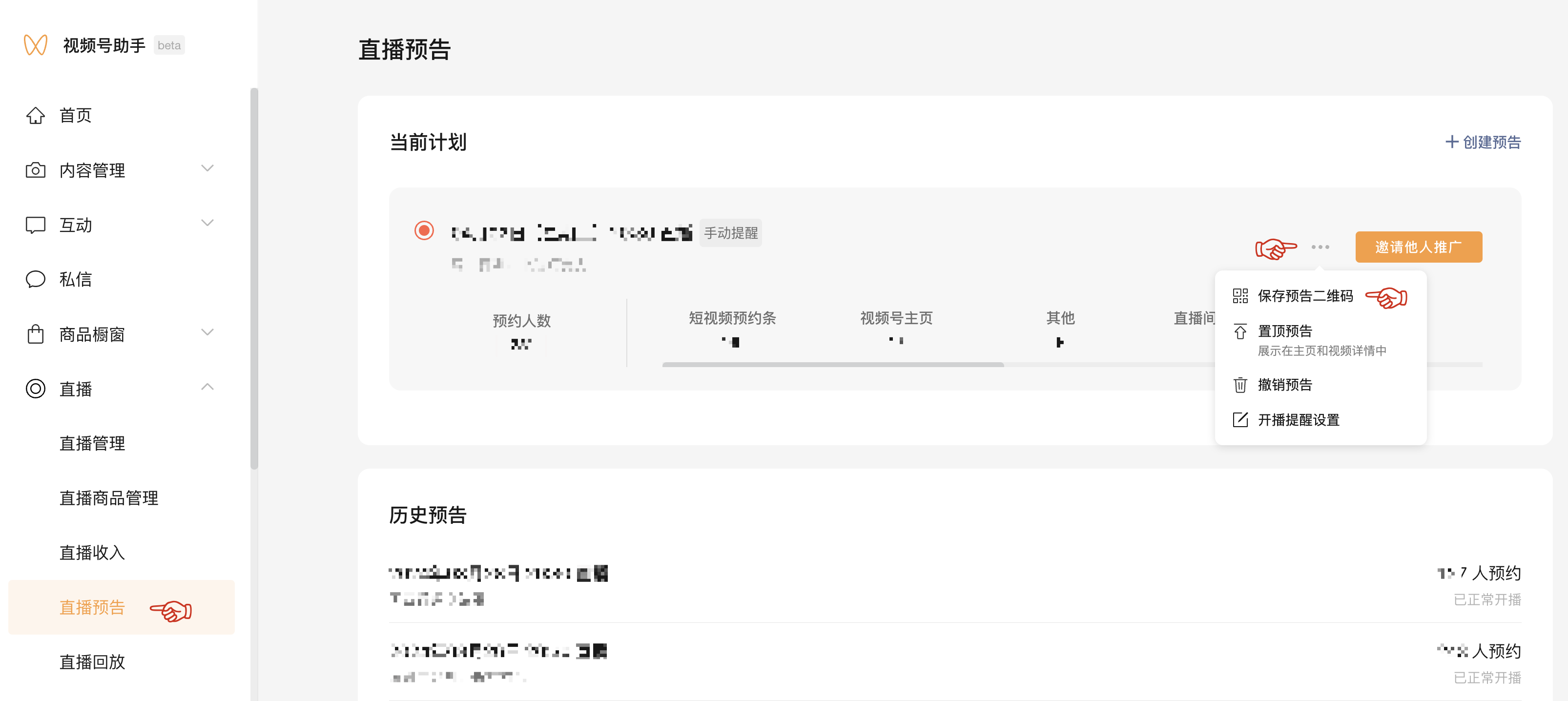 在左侧菜单找到「直播预告」,再选择相应的直播预告(如果没有就创建一个预告),点击右侧三个点,选择「保存预告二维码」。