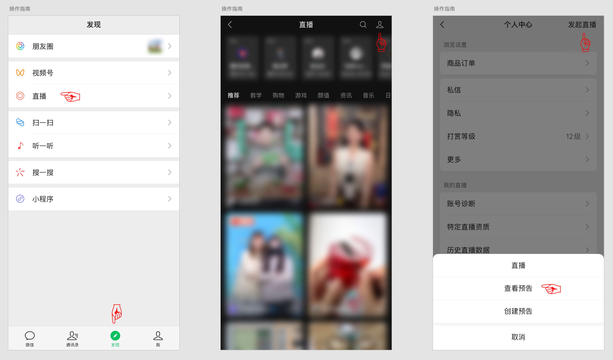 打开微信,点击下方「发现」,再点击「直播」进入直播页面。点击右上方的「个人」入口。