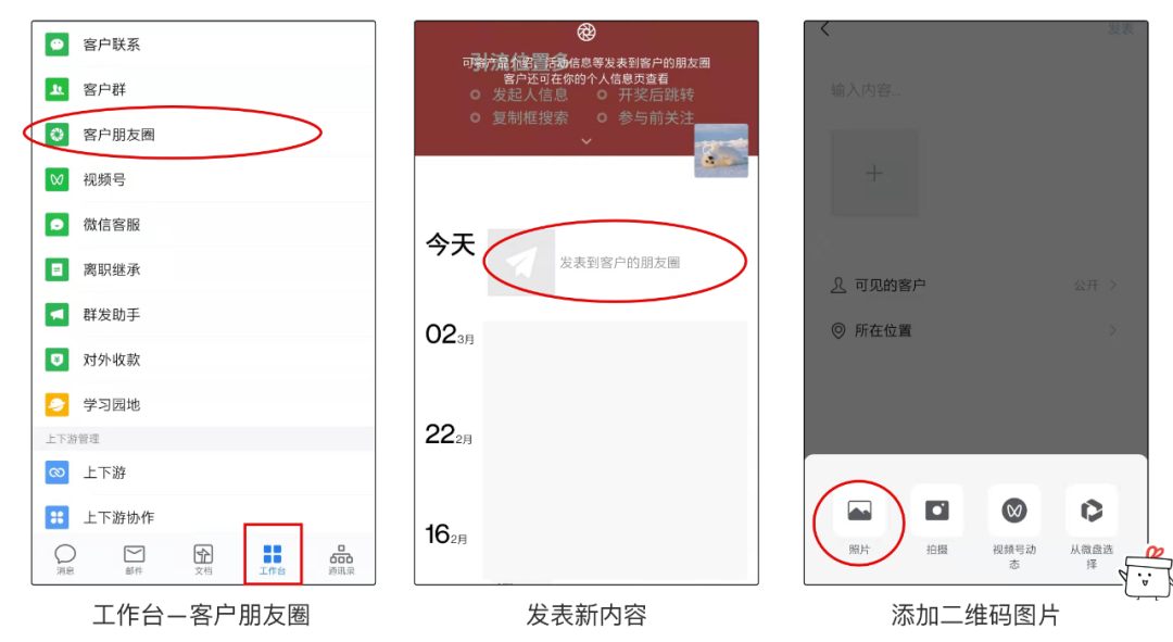 进入企业微信——客户朋友圈——发表,添加二维码照片,发布。