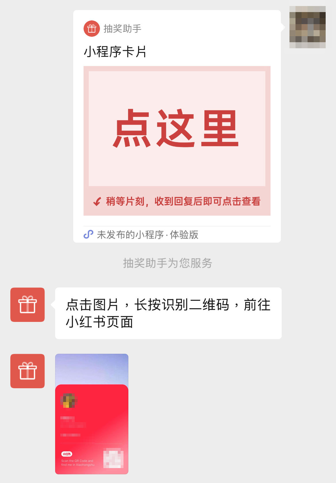 **第三步:**点击提示,发送卡片,稍等片刻,就可以收到返回的小红书链接。