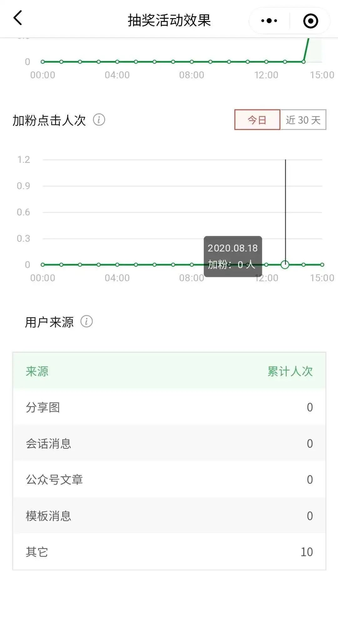统计维度包括:访问人次,参与人数,分享人次,加粉点击和用户来源。
