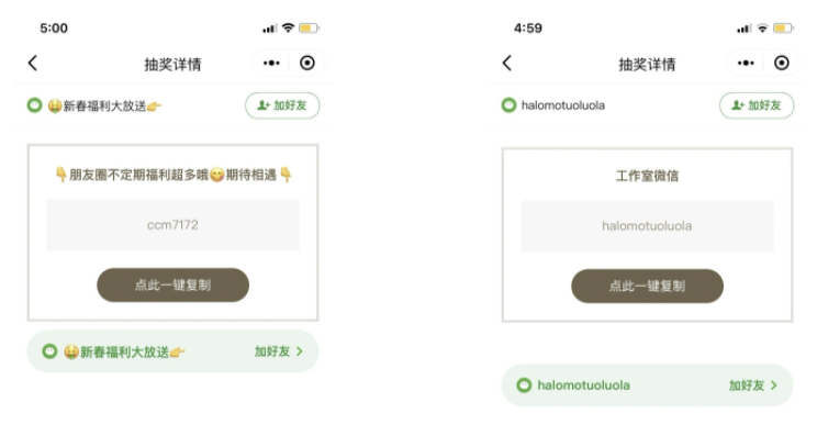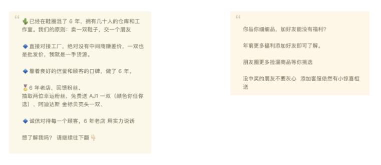 朋友圈也可以推一推抽奖活动。用户可能会被吸引,询问购买详情或是否有「好友折扣」,流畅转化销售。