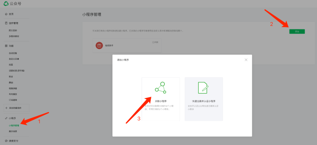 进入公众号管理后台,在**「小程序管理——添加——关联小程序」中**,搜索「抽奖助手」,完成绑定。