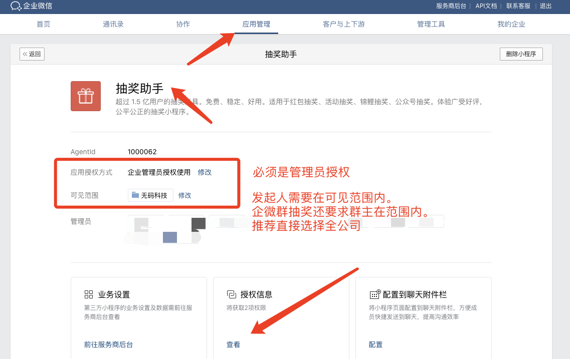 你需要企业授权,并添加抽奖助手小程序为企业微信服务商。来使用对应功能。