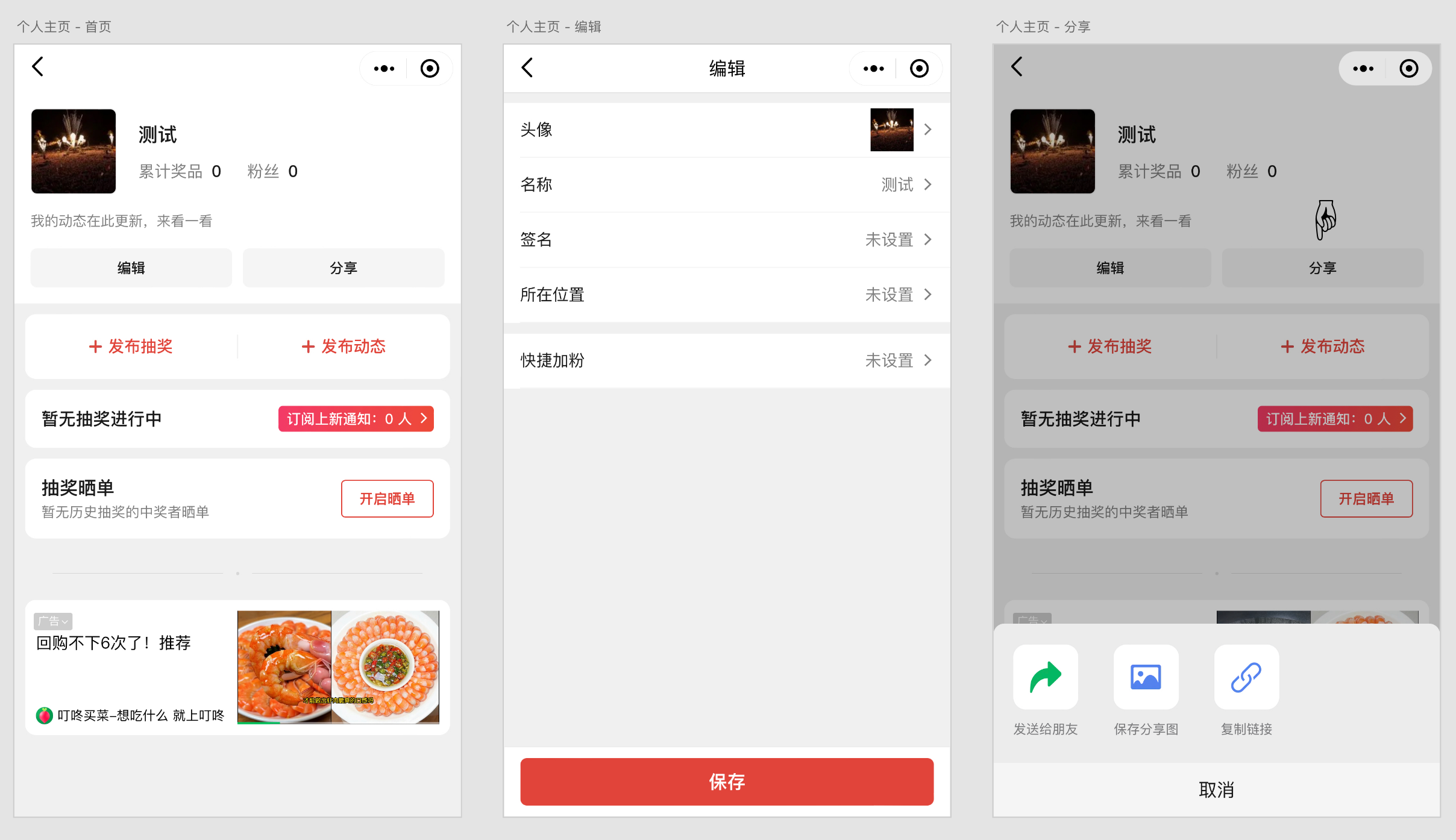 点击「分享」,能以不同的方式分享主页。和抽奖分享图或分享链接不同,主页的分享图或链接并不会变化。