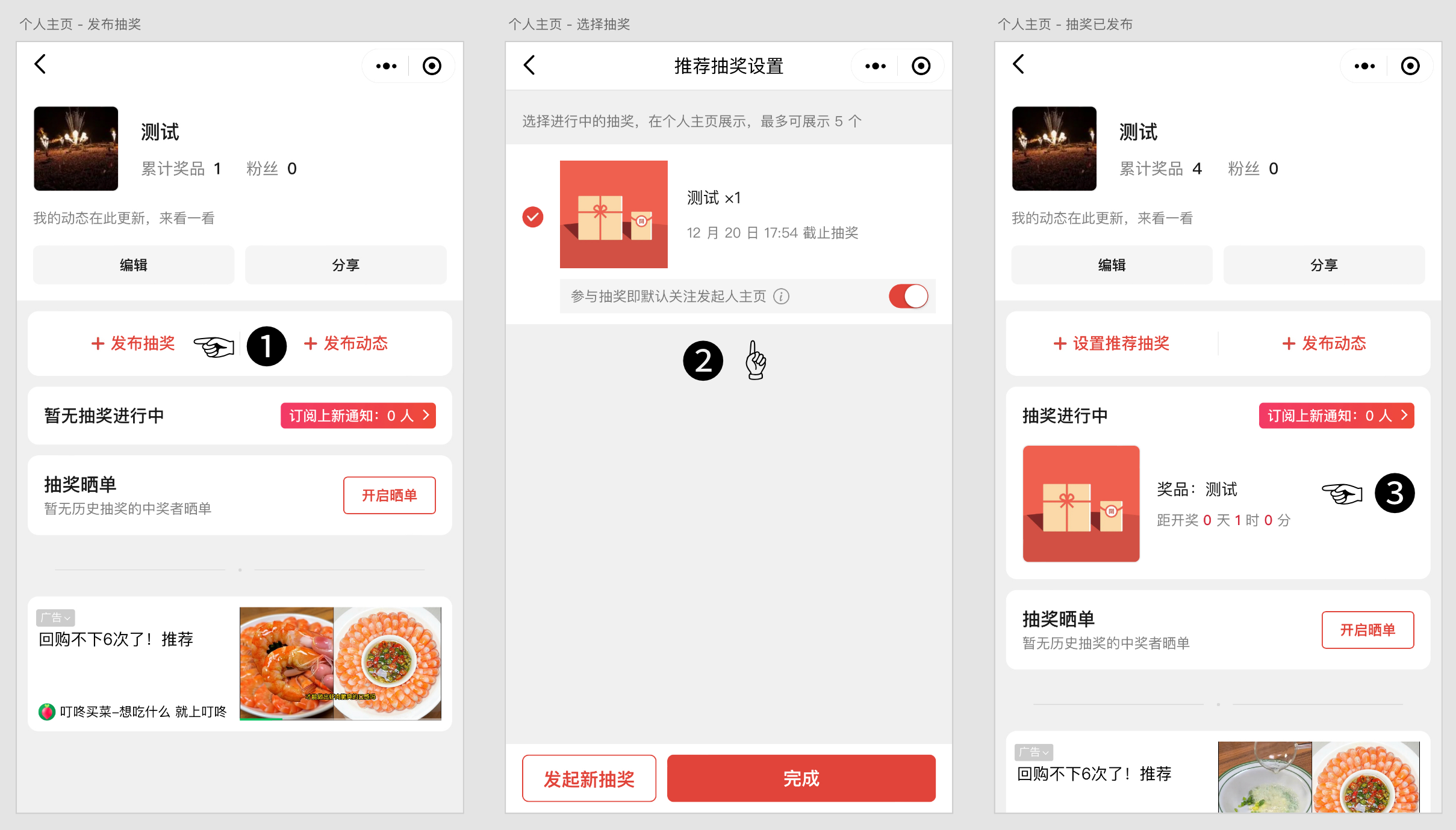 如果其他用户想在主页参与你的抽奖,必须先点击「发布抽奖」,将进行中的抽奖展示到主页上: