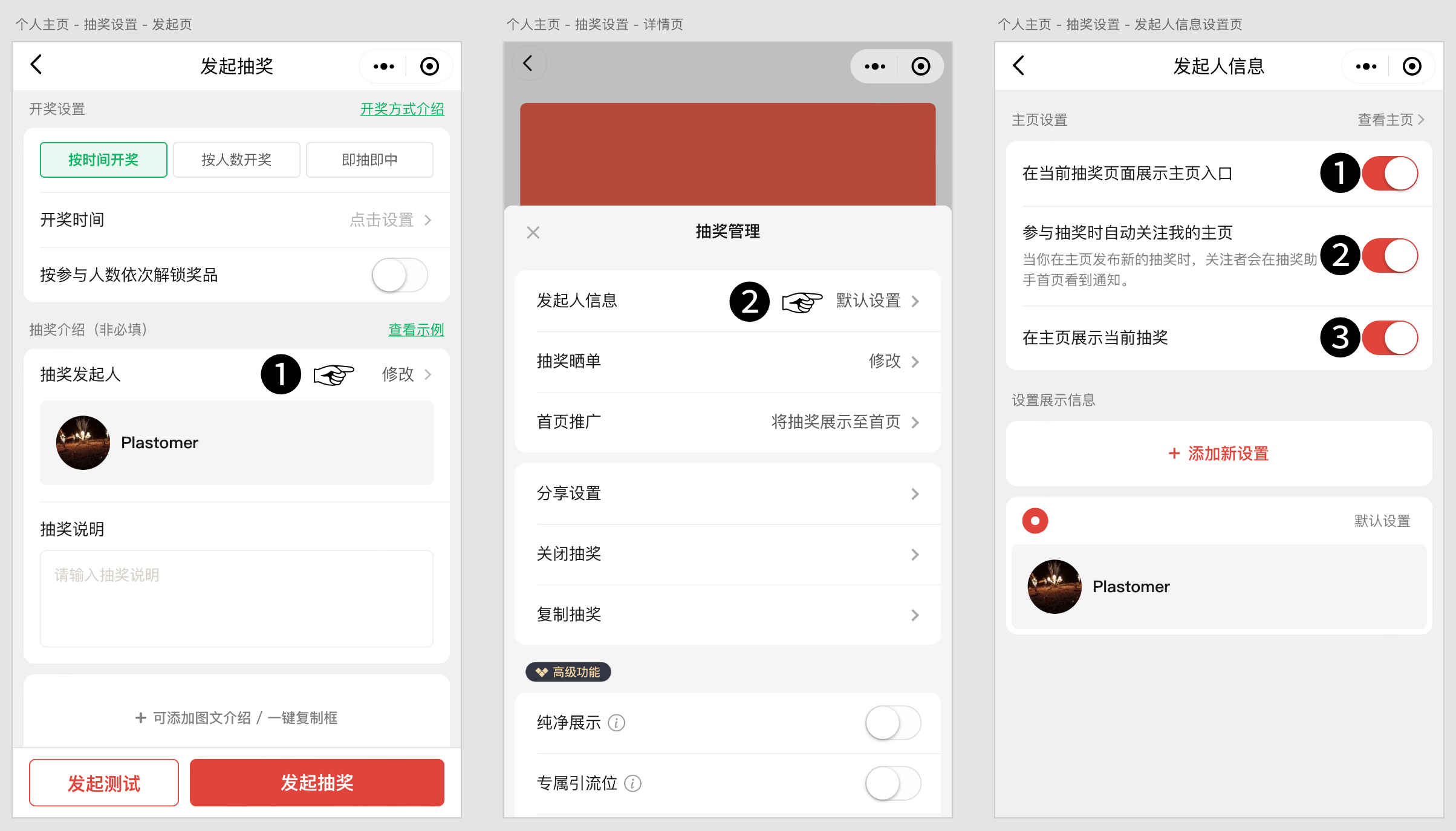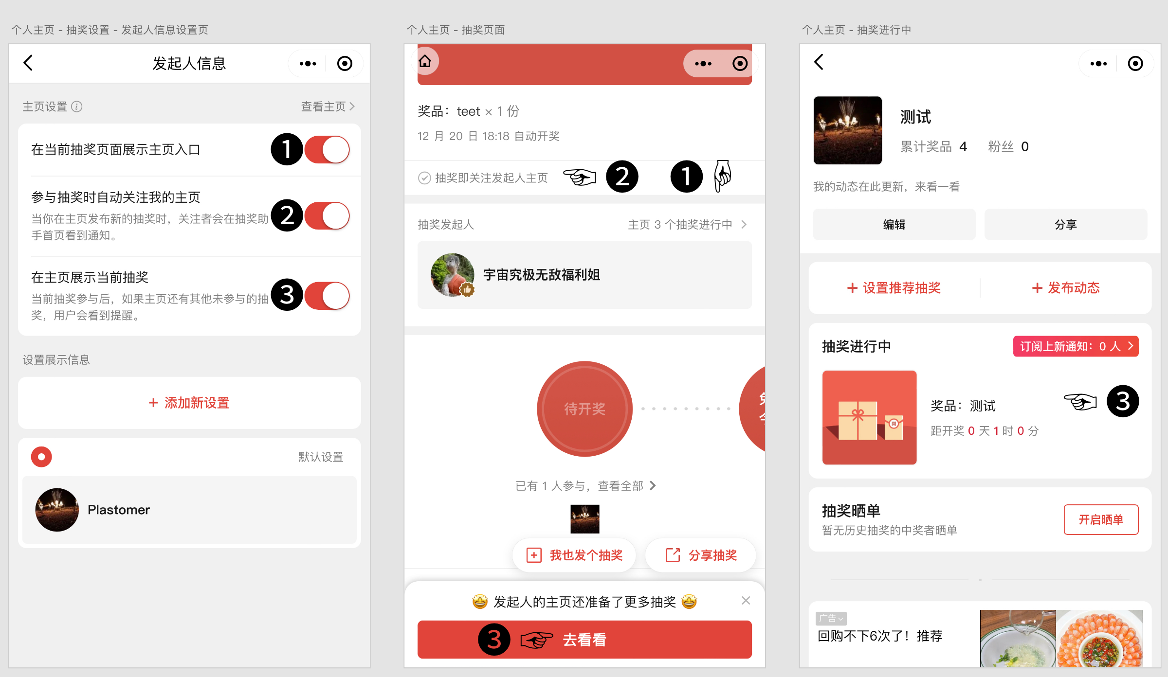 「展示主页入口」会让主页入口出现在「抽奖发起人」的右侧,如果主页有抽奖展示,还会显示展示中的抽奖数量。