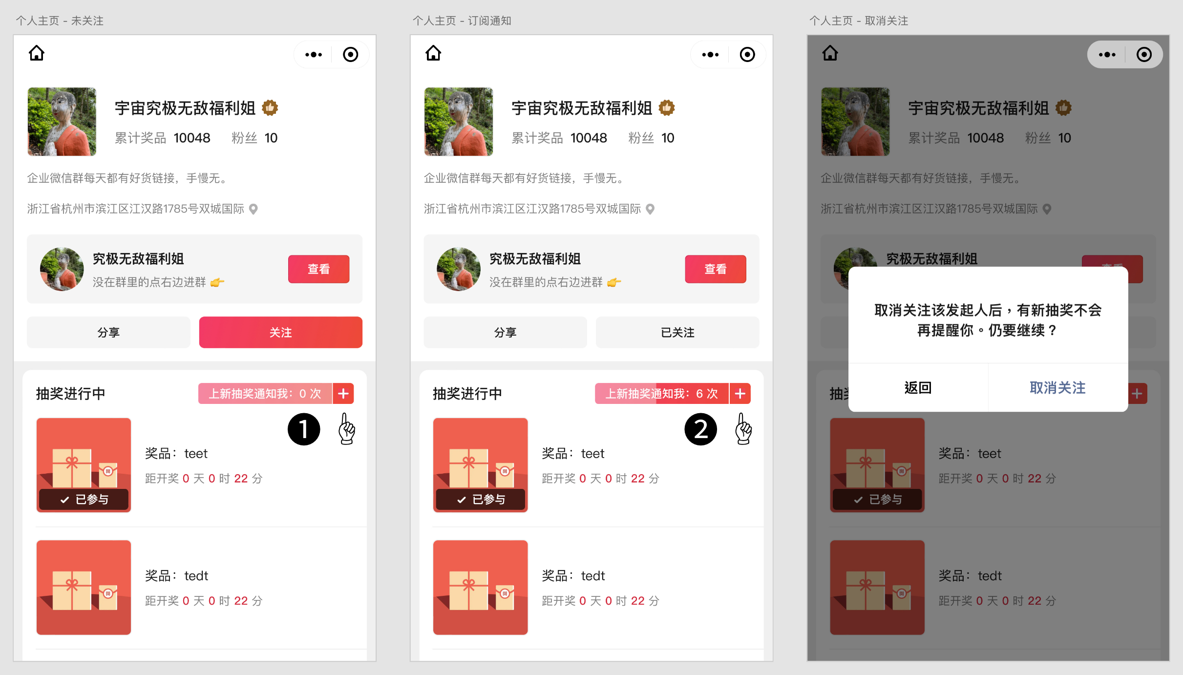其他人访问你的主页时,可以订阅你的新抽奖提醒: