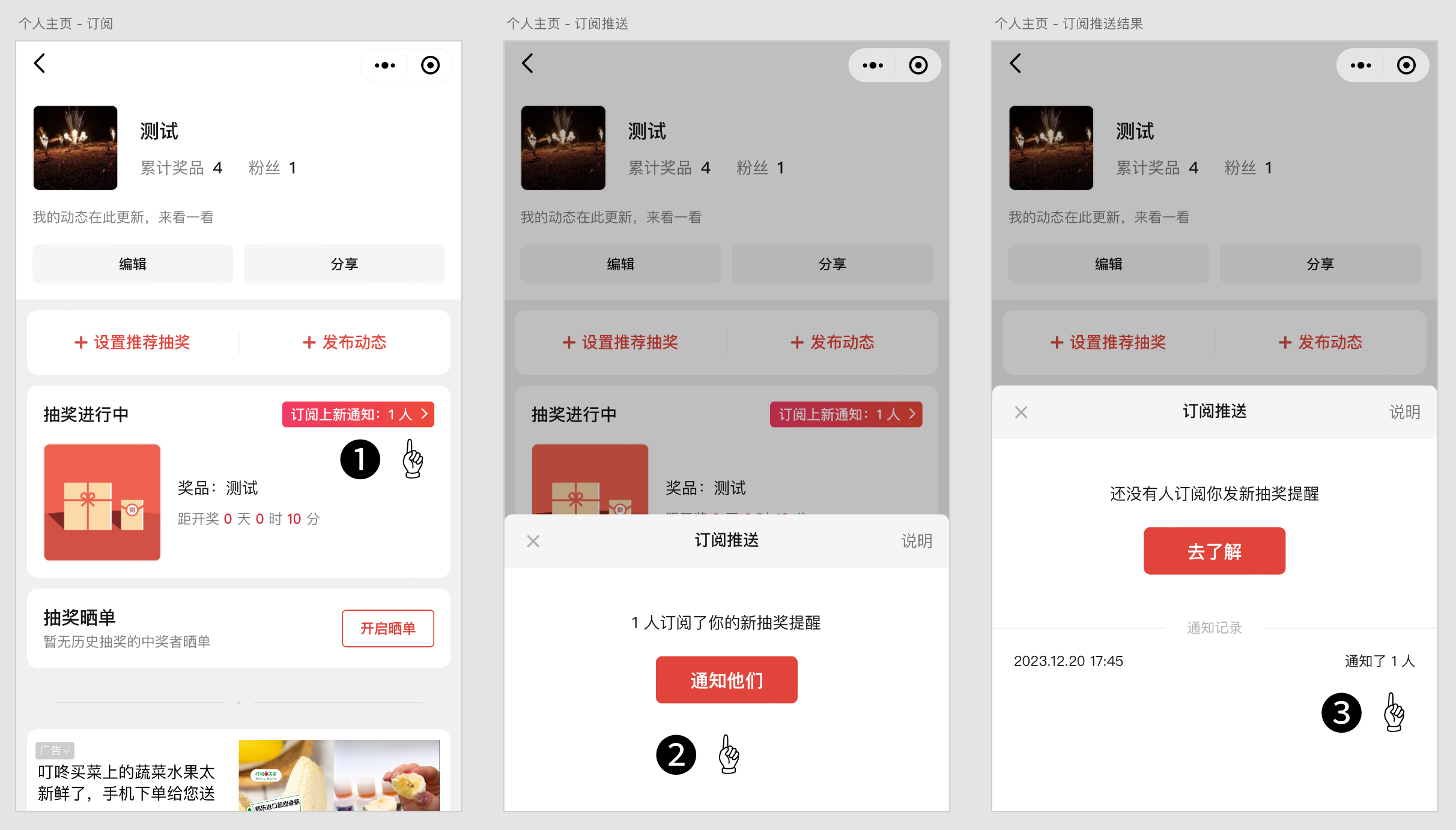 当你设置了抽奖在主页展示时,你可以向订阅者推送消息,让他们来你的主页参与抽奖。