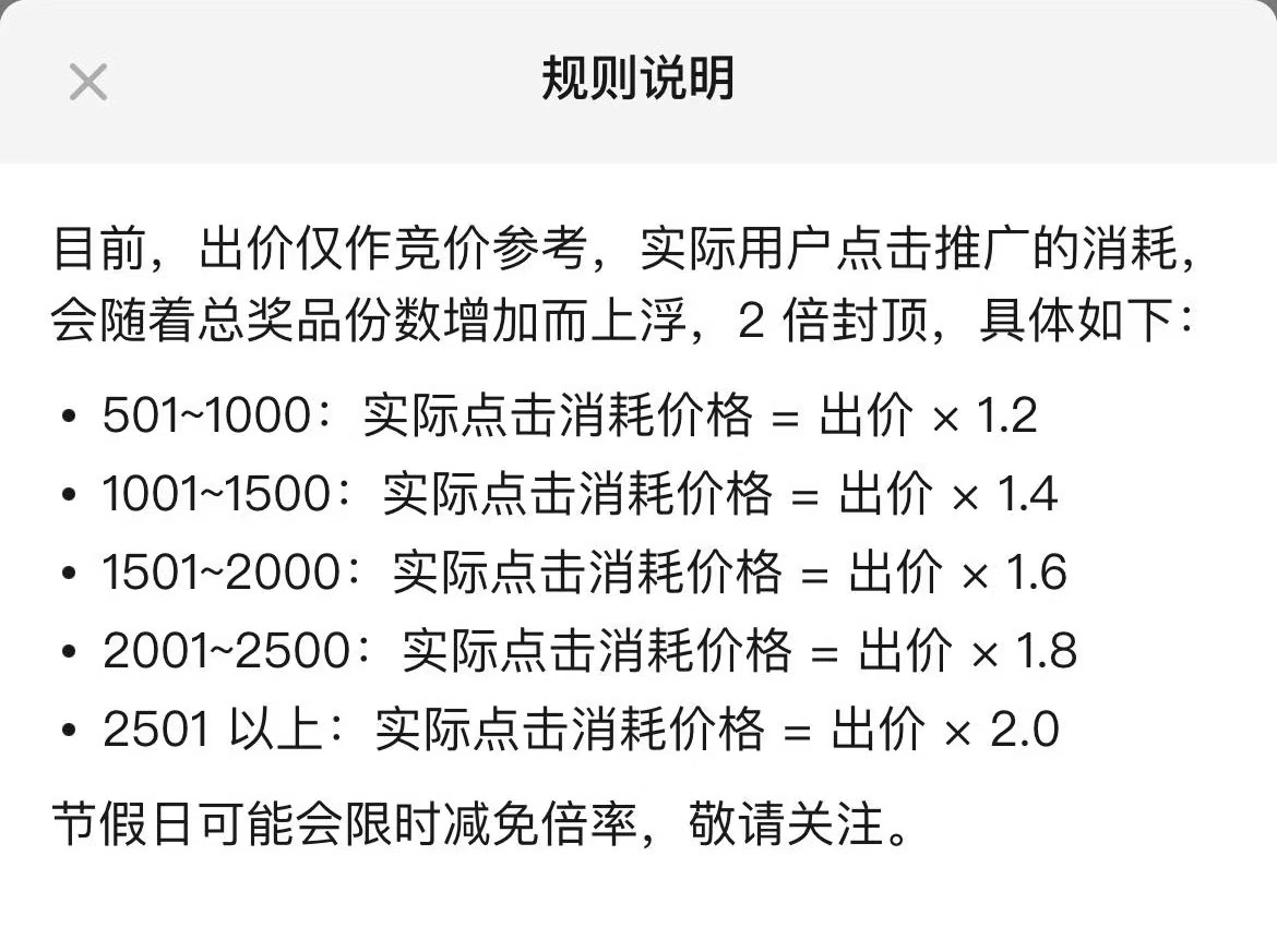 为方便设置不同奖品数量的用户投放,奖品总份数超过 500 时将采用加倍出价的策略,不同奖品数量对应的倍率如下图所示,例如,总奖品份数为 501 份,设置的出价为 1 元,实际消耗的价格为 1.2 元。节假日可能会有限时减免活动。