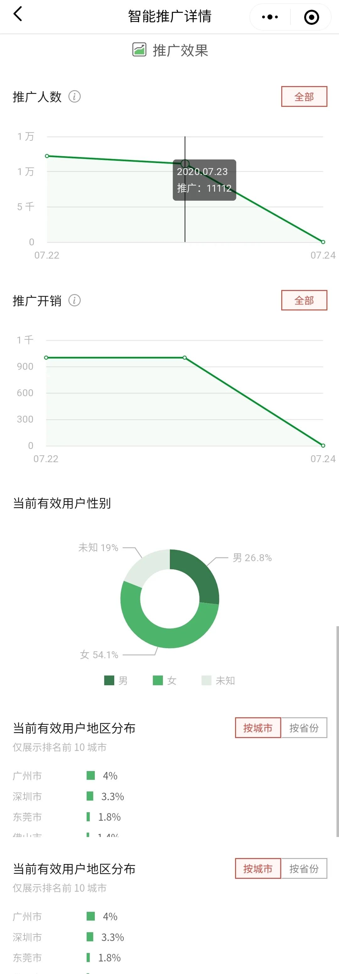 智能推广提供效果反馈,你可以随时查看效果统计页面,了解当前推广情况。