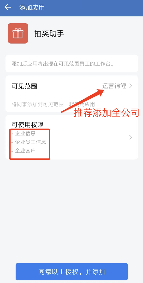 使用「加企微参与」功能,需要企业授权,并添加抽奖助手小程序为企业微信服务商。