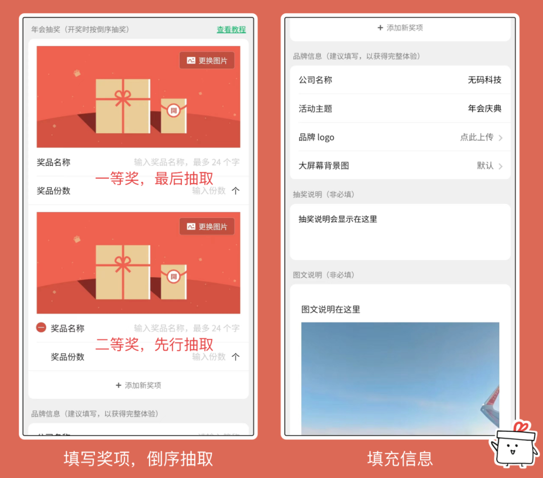 按从高至低的顺序,依次填入奖品图片、名称、份数。抽取时将倒序抽取,即从末等奖开始,最后抽取第一个填写的奖项。