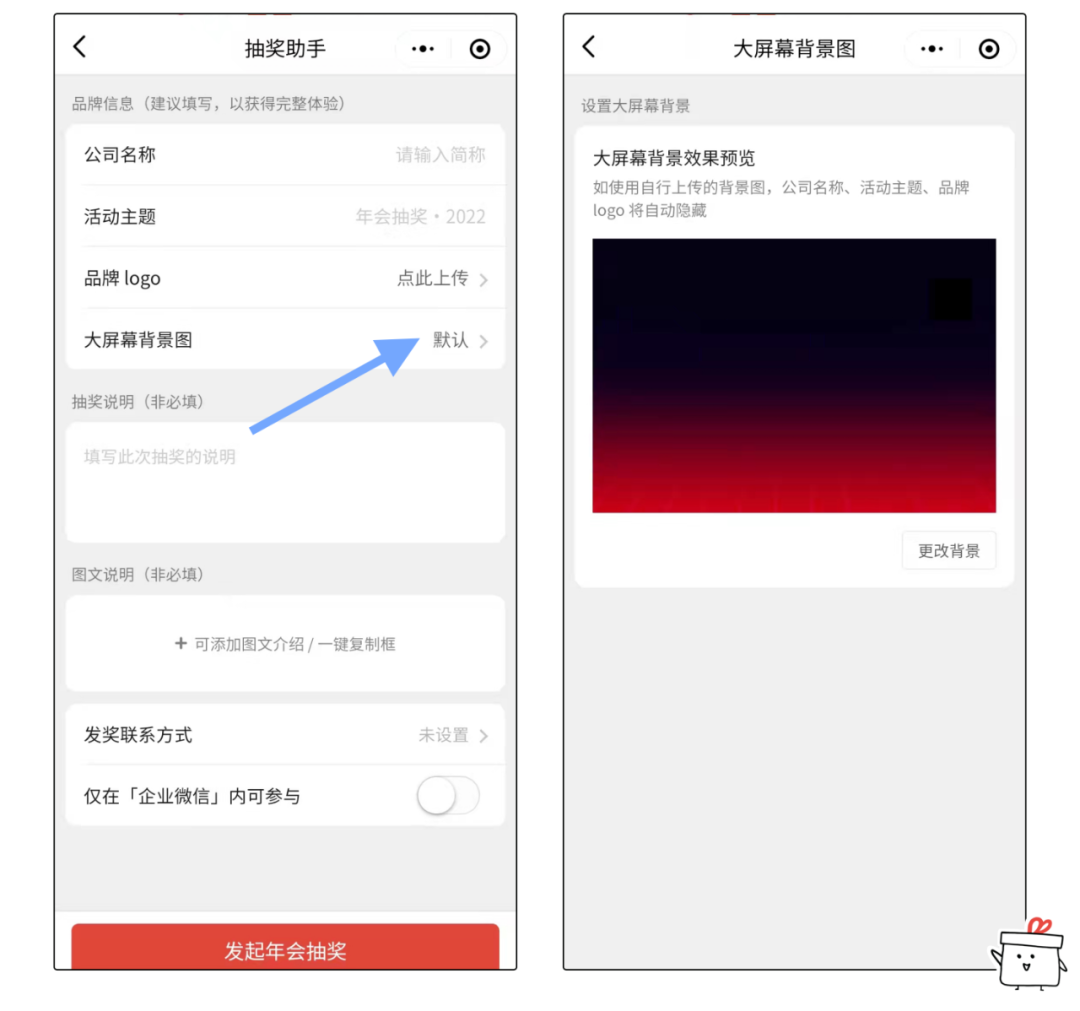 点击「大屏幕背景图」,可变更投屏后的抽奖背景图(图片仅在投屏端抽奖开始之前展示,手机端/抽奖开始后的背景图不支持更改)。