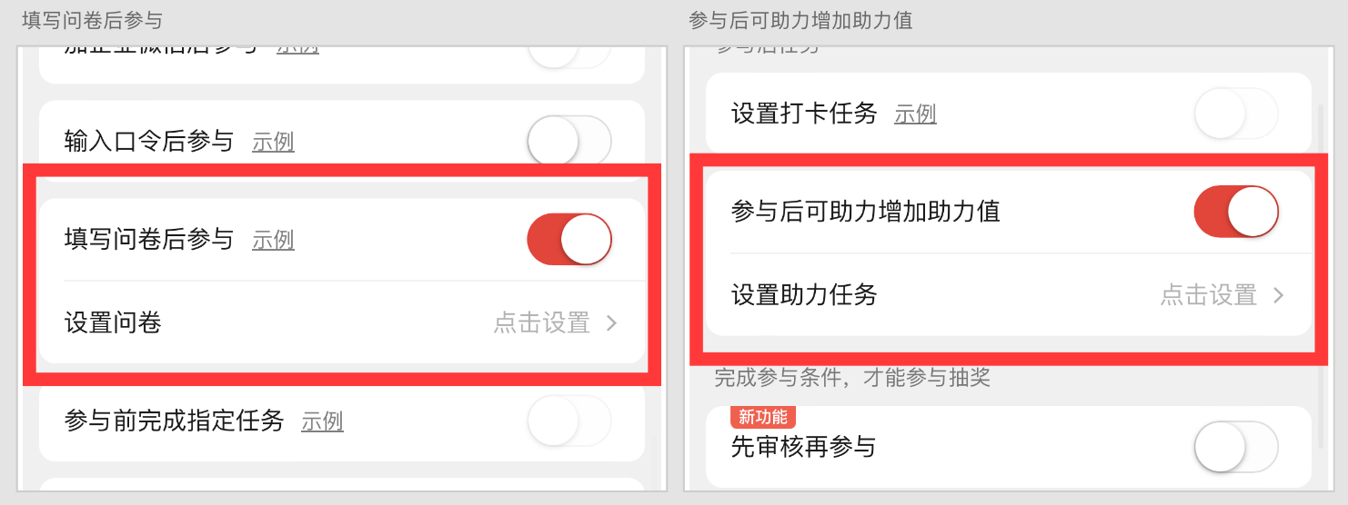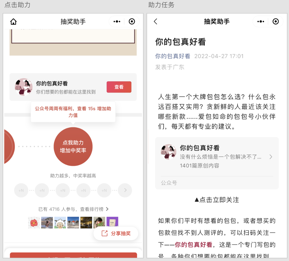 助力可以设置:小程序、推文、图片、视频号多类型叠加,完成后获取助力值。