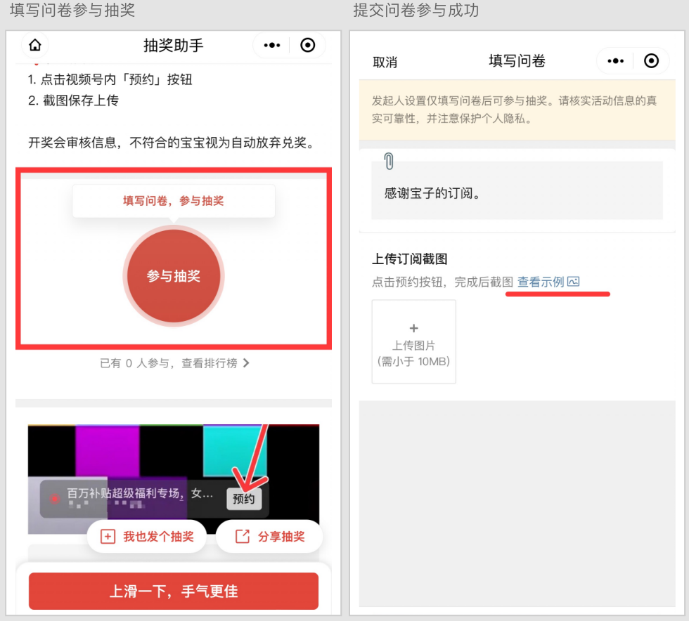 点击参与按钮 - 弹出问卷内容(可查看示例图) - 提交成功即参与成功。