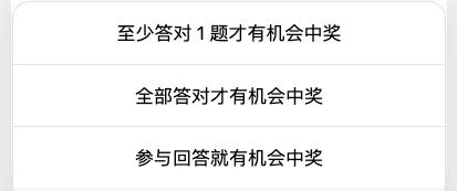 模式设置:答对 1 题有机会中奖/全部答对有机会中奖/参与就有机会中奖,三种模式。