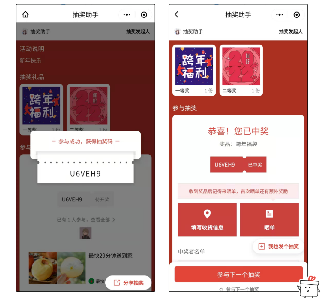 用户进入抽奖后,可以直接点击按钮,获取抽奖结果。抽取规则类似于彩票,你设置的「最多参与人数」,等于总彩票发行数量,到达这个参与人数,所有奖项都会被抽出。