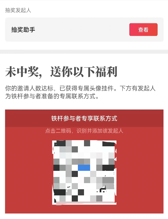 符合邀请条件的参与者,将在抽奖结束后,看到如下提示。可根据二维码联系发起人。