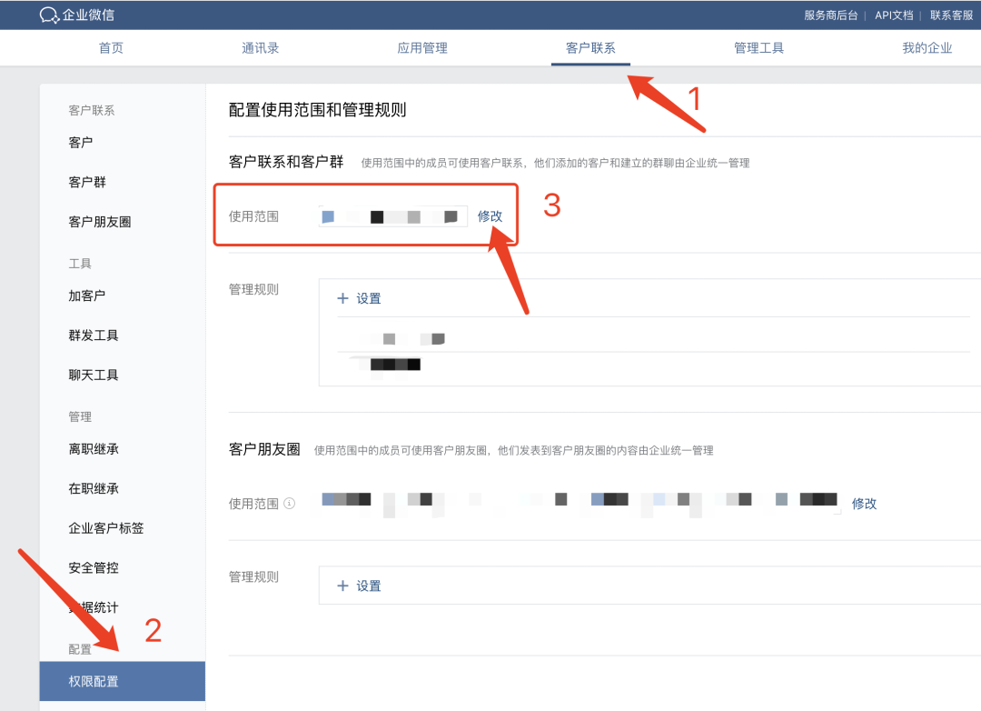 2. 进入客户联系——权限配置——使用范围中,添加你为权限使用用户。