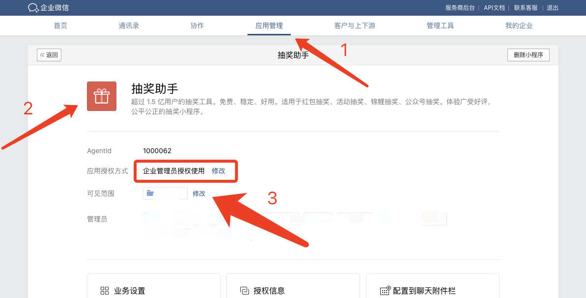 3. 登录企业微信后台——应用管理——运营助手,将发起人配置为「可见权限用户」。