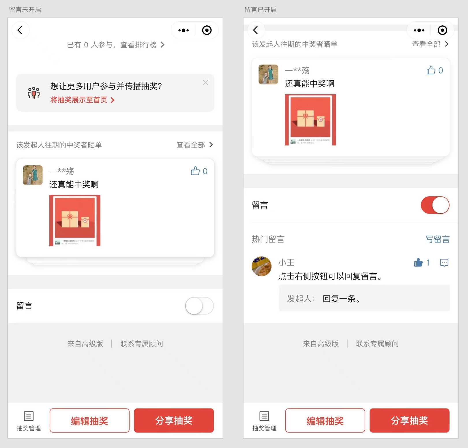 开启留言,可以更好地与参与者互动,活跃抽奖气氛,增强用户粘性。