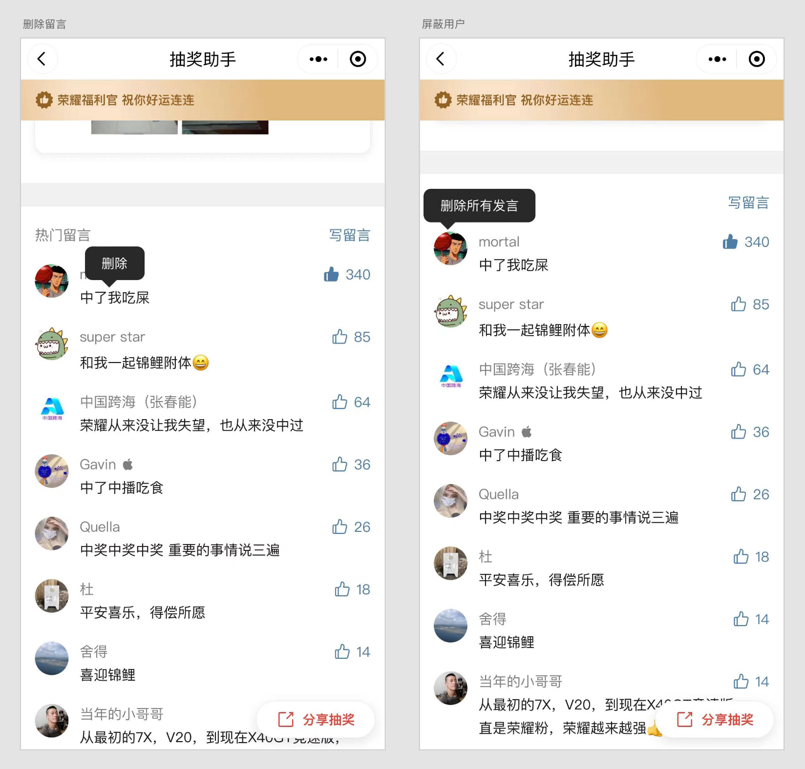 如果评论区出现了不友善留言,发起者长按留言可以删除单条留言;如果用户反复留言骚扰,可以长按用户头像屏蔽用户,被屏蔽的用户不能在该抽奖下继续留言,已经发布的留言也都将被删除。