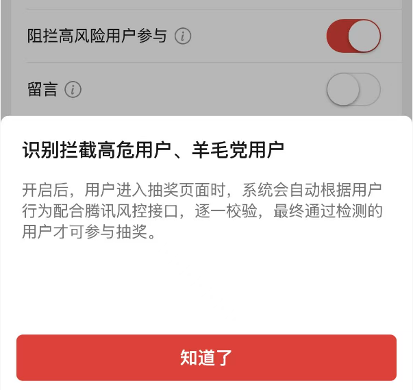 抽奖助手接入了腾讯反作弊系统,对于参与用户都会进行风险识别、及时阻拦羊毛党的参与。