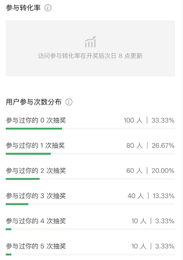 参与转化率:统计去重后的参与转化率数值。(总参与人数/开奖前总访问人数),活动结束后展示。